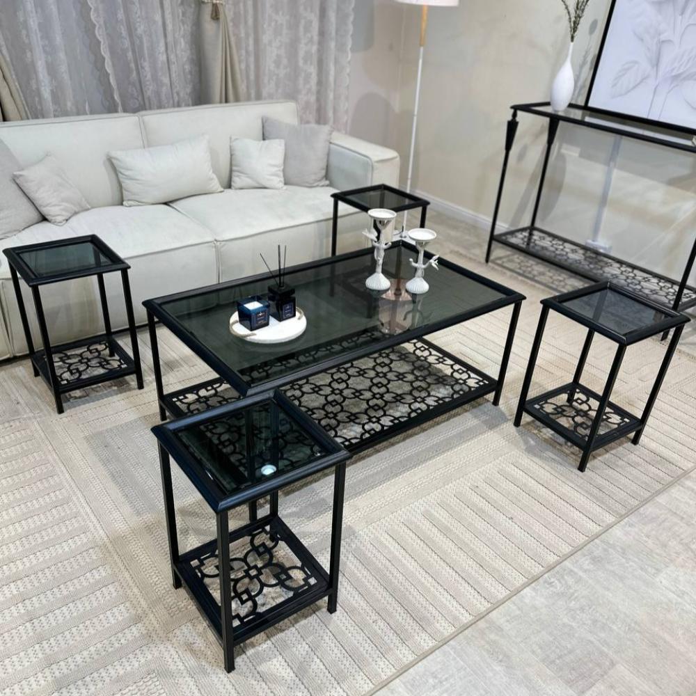 طقم طاولة قهوة مودرن يجمع بين البساطة والفخامة، مع سطح زجاجي شفاف وقواعد معدنية سوداء أنيقة. يتضمن الطاولة الرئيسية المستطيلة وطاولات جانبية صغيرة متناسقة، ليمنح المساحة لمسة عصرية راقية وتوازنًا بصريًا مميزًا.